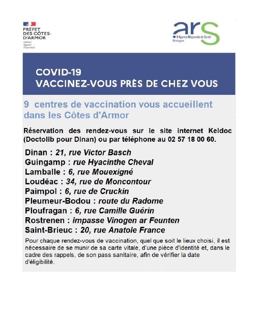 Vous trouverez ci-dessous une affiche de synthèse des centres de vaccination du département des Côtes d’Armor :